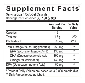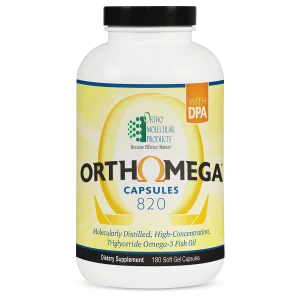Orthomega® 820 provides 820 mg of eicosapentaenoic acid (EPA) and docosahexaenoic acid (DHA) as well as 50 mg of docosapentaemoic acid (DPA) per soft gel as re-esterified triglycerides, the preferred form with superior absorption. Vitamin E (as mixed tocopherols) and rosemary extract are used to ensure maximum purity and freshness. 180 capsules.