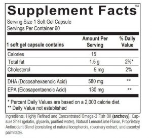 Orthomega® 820 provides 820 mg of eicosapentaenoic acid (EPA) and docosahexaenoic acid (DHA) as well as 50 mg of docosapentaemoic acid (DPA) per soft gel as re-esterified triglycerides, the preferred form with superior absorption. Vitamin E (as mixed tocopherols) and rosemary extract are used to ensure maximum purity and freshness. 60 capsules.