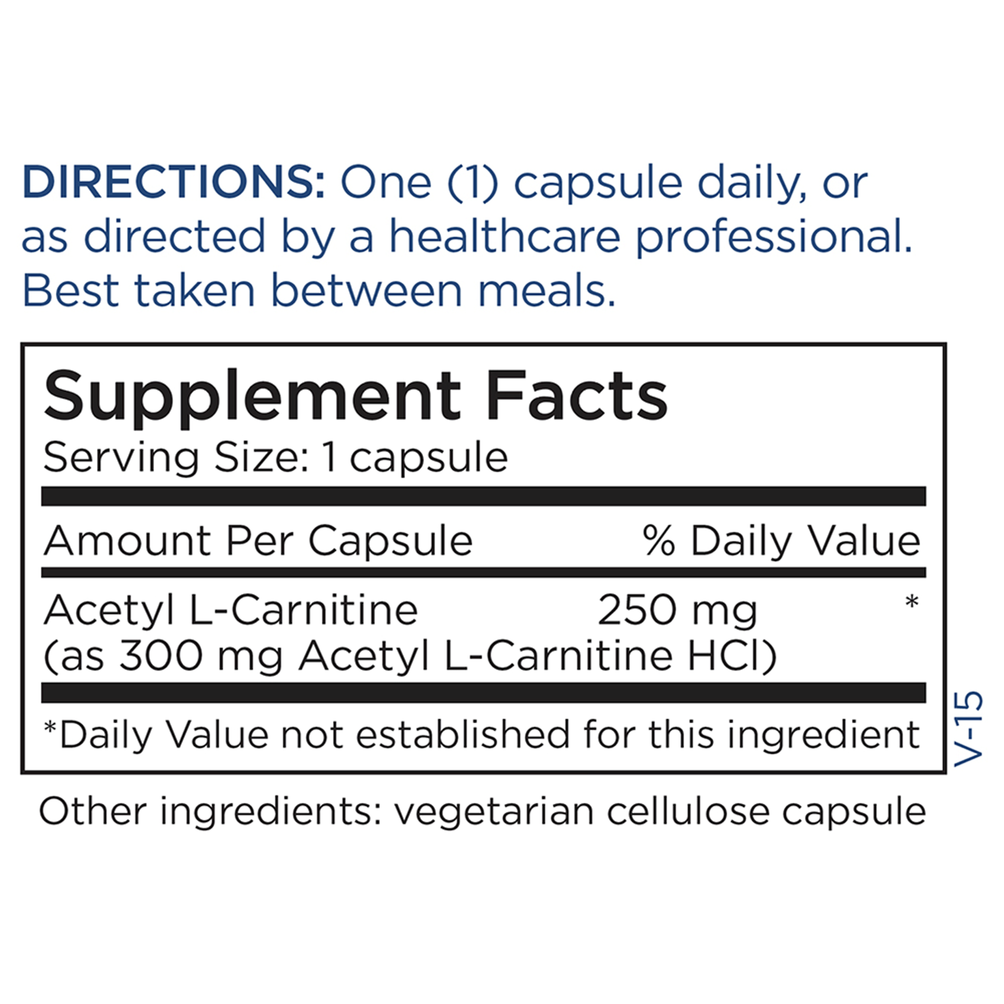 Source Materials: Acetyl L-carnitine is made by chemical synthesis. Cellulose for capsules is derived from softwood tree pulp. All ingredients are vegan and non-GMO.   Allergens:  According to information provided by our suppliers, these capsules are free of the eight major allergens as identified by the Food Allergen Labeling and Consumer Protection Act of 2004 (FALCPA): Wheat (gluten), eggs, milk, soybeans, shellfish, fish, peanuts, tree nuts.   Recommendations: Use as directed by a healthcare professional.   Precautions: Pregnant or lactating women and individuals taking prescription medications should consult with a healthcare professional before taking any supplement.