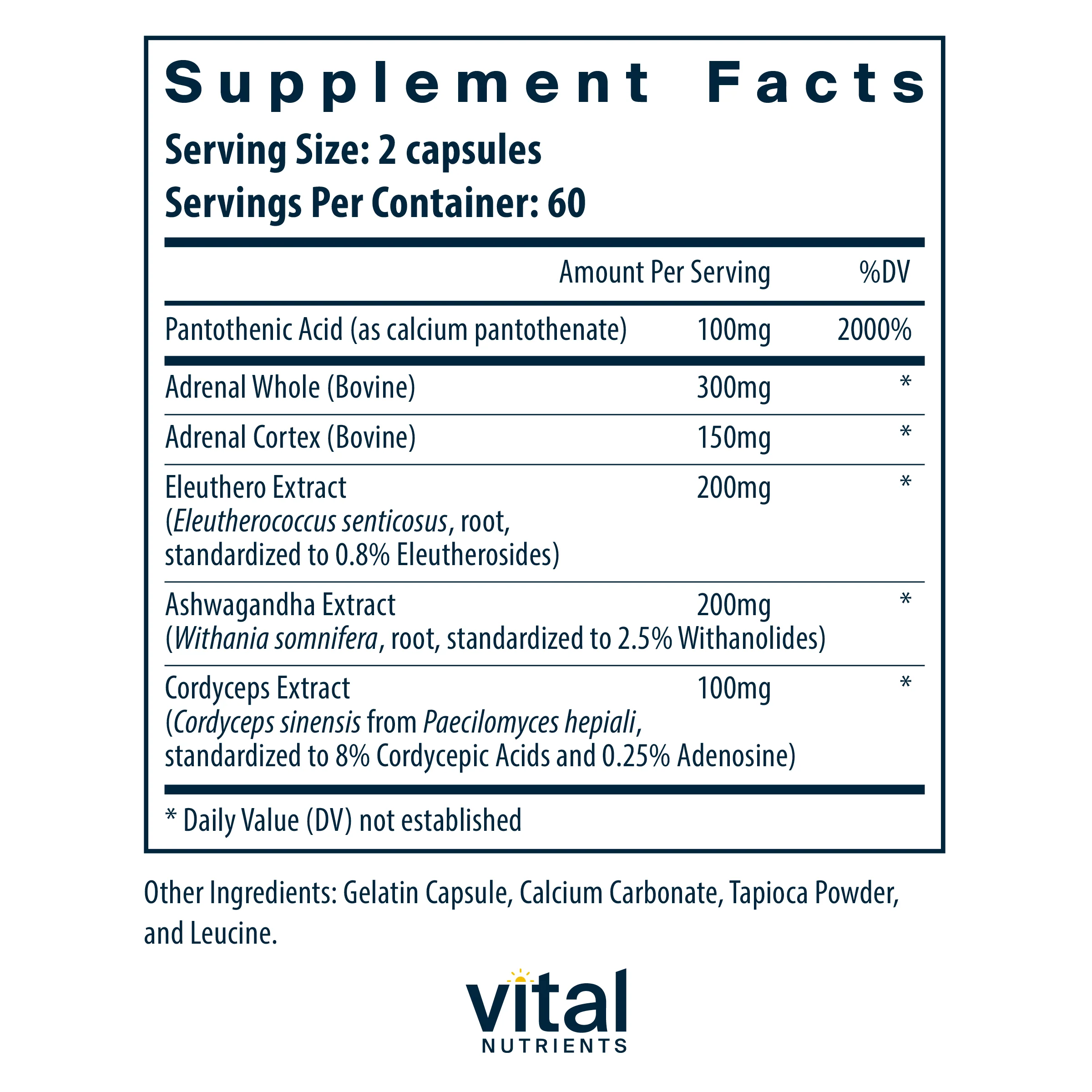 Adrenal Support is a combination of whole adrenal, adrenal cortex and adaptogenic herbs that nutritionally support the adrenal glands to promote stress resistance and energy.* The formula includes Ashwagandha Root extract to help maintain balanced levels of adrenal hormones and promote a general sense of well-being.* Adrenal Support also includes Pantothenic Acid (vitamin B5), which is an important cofactor for macronutrient metabolism and hormone synthesis.* The ingredients in Adrenal Support work together to support the body’s ability to produce certain adrenal hormones, which helps maintain a healthy immune system and relieve mild stress and frustration.*