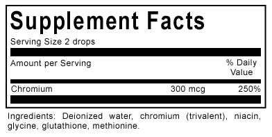Chromium promotes the maintenance of cholesterol levels that are already within the normal range, as well as the metabolism of fats and sugars. It is necessary for the uptake of glucose into cells. 0.5oz liquid drops.