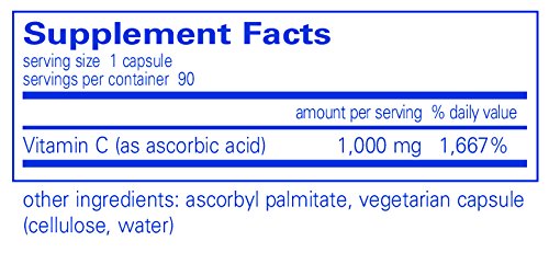Vitamin C (ascorbic acid) provides nutritional support for many physiological functions, including, vascular integrity, connective tissue regeneration and maintenance, and support for the immune system. It is a potent antioxidant and free radical scavenger. It supports the body’s defense system by enhancing white blood cell function and activity, and increasing interferon levels, antibody responses, and secretion of thymic hormones. It is essential for the formation and maintenance of intercellular ground substance and collagen. Vitamin C aids in the absorption of iron and the formation of red blood cells and helps convert folic acid to its active form, folinic acid. Vitamin C maintains healthy histamine release and supports lymphocyte formation. Vitamin C is also required for the synthesis of carnitine and steroids. Many studies have shown the benefits of oral and IV administration of this vital nutrient. Pure Ascorbic Acid provides a potent 1000mg per capsule, minimizing the number of capsules required to reach high doses. Usual dose is 1 capsule daily, or as directed by your physician.