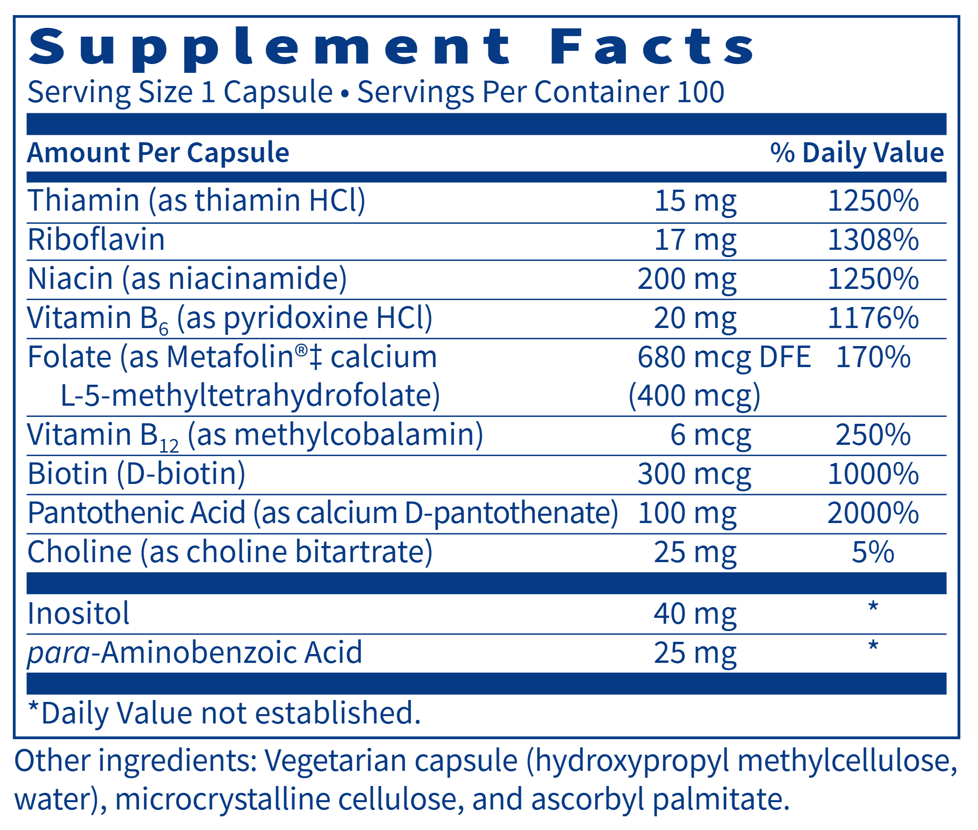 B vitamins are essential nutrients required for optimal health and functioning of numerous systems and biochemical reactions in the body, including energy production, brain, liver and nerve cell function, and muscle tone in the GI tract. 100 capsules.