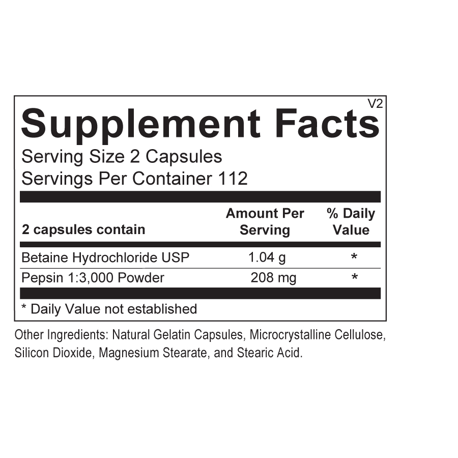 Betaine and Pepsin is designed for those who want a digestion aid, as the potency and volume of gastic juice can be reduced with age. This makes it difficult to digest foods after a meal. This formula can also help anyone seeking enhanced digestive function. Betaine HCl is an acidic form of betain used to lower stomach acid pH. Pepsin is an enzyme produced naturally in the stomach to aid in the digestion of proteins. Usual dose is 1-2 capsules before each meal, or as directed by your physician.