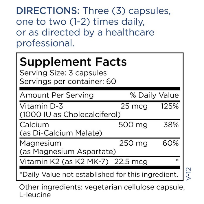 Source Materials: Vitamin D3: lanolin from sheep’s wool. Vitamin K2 MK-7: fermentation of soy with Bacillus subtilis natto (all soy removed). Minerals are mined. Chelating agents include: citric acid (corn fermentation), malic acid and aspartic acid (synthetic). Cellulose for capsules is derived from softwood tree pulp. All ingredients are non-GMO. Allergens: According to information provided by our suppliers, these capsules are free of the eight major allergens as identified by the Food Allergen Labeling and Consumer Protection Act of 2004 (FALCPA): Wheat (gluten), eggs, milk, soybeans, shellfish, fish, peanuts, tree nuts. Recommendations: Use as directed by a healthcare professional. Precautions: Pregnant or lactating women and individuals taking prescription medications should consult with a healthcare professional before taking any supplement.