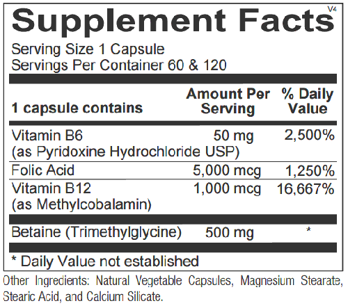 Folate Adequate folate status is critical for maintaining optimal methylation, red blood cell balance, DNA and RNA synthesis and healthy cell division and replication. Folic acid is converted into its metabolically active form, 5-MTHF, by the enzyme methylenetetrahydrofolate reductase (5-MTHFR). 5-MTHF donates its methyl group to vitamin B12 (cobalamin), forming methylcobalamin. Methylcobalamin helps convert the problematic amino acid metabolite homocysteine into the amino acid methionine. B12 Vitamin B12 (methylcobalamin) works along with folic acid in many body processes, including the synthesis of DNA, red blood cells and supporting health of the myelin sheath, the insulating exterior that surrounds nerve cells. B12 is found primarily in animal foods. Vegetarians and the elderly are at highest risk for B12 deficiency. B12 is considered by many to be a vital nutrient required to balance homocysteine levels. Methylcobalamin is the biologically active form of B12 and supports up-regulation of methylation pathways. B6 Vitamin B6 (pyridoxine) is a B vitamin that is required for more than 60 different enzymatic reactions that occur in the body. Vitamin B6 works along with folic acid and B12 for in the recycling of homocysteine. B6 also supports a healthy cardiovascular system by promoting healthy platelet aggregation and aids in maintaining healthy blood pressure. Vitamin B6 is required for the activation of lysyl oxidase, an enzyme responsible for the cross-linking of collagen, and elastin, which is crucial for maintaining normal circulation and arterial function. Trimethylglycine (Betaine) Trimethylglycine (betaine) functions in the body as a unique methyl donor, supporting liver function and detoxification pathways and the conversion of homocysteine to methionine. Trimethylglycine also works alongside B6, B12 and folic acid in supporting homocysteine balance.