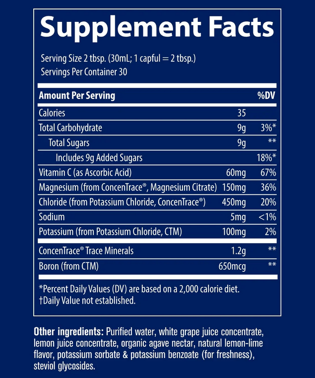 Flavored ConcenTrace is a naturally balanced and concentrated liquid trace mineral supplement developed to support energy production and overall health.* 30 fl oz liquid.