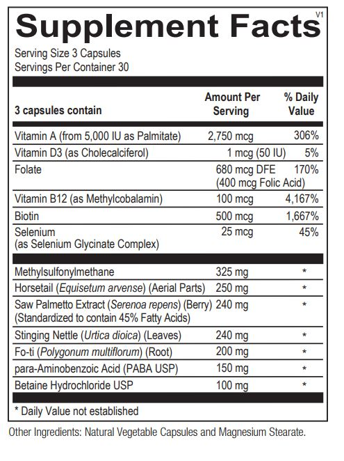 Cosmedix provides several essential vitamins, minerals and phytonutrients needed to support healthy skin, hair and nails. Cosmedix provides betaine HCl, which helps to promote efficient digestion and assimilation of proteins and minerals necessary for hair and nail health. It includes MSM, which provides a bioavailable source of sulfur, for connective tissue integrity. Saw palmetto is added to support normal levels of DHT, known to play a role in the thickness and health of hair. In addition, silica (from horsetail grass extract) is included for its collagen-enhancing properties.
