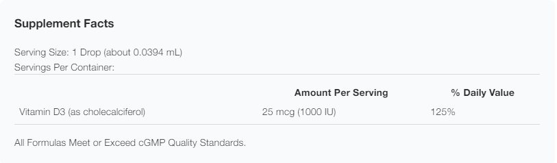 Vitamin D Liquid (cholecalciferol) 1000 IU drops. 2.03 fluid ounces.