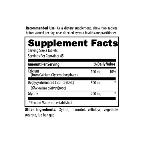 GastrointestinalDGL Synergy™ is a fast-acting, chewable formula of deglycyrrhizinated licorice (DGL) which offers support for the gastric mucosa.** It contains a standardized high-quality form of DGL, the amino acid glycine, and calcium in the form of calcium glycerophosphate. DGL Synergy™ has a pleasant licorice flavor and is fructose and sugar-free. It is sweetened with the polyols xylitol and mannitol, and the plant extract luo han guo. Recommended Use: As a dietary supplement, chew two tablets before a meal per day, or as directed by your health care practitioner.