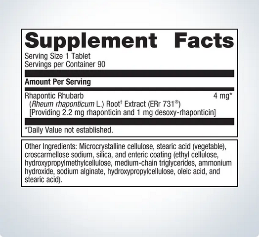 | Rhapontic Rhubarb (Rheum rhaponticum L.) Root† Extract (ERr 731®) [Providing 2.2 mg rhaponticin and 1 mg desoxy-rhaponticin] | 4 mg | * |