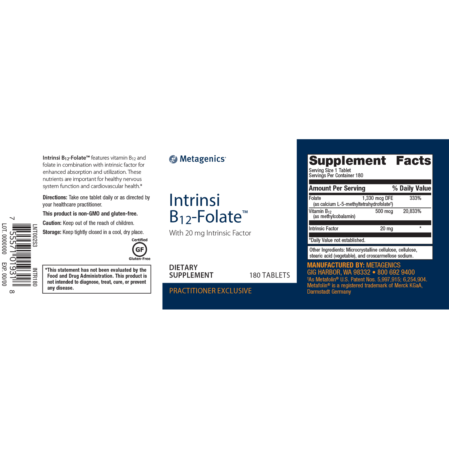 Intrinsi B12-Folate™ features vitamin B12 and folate in combination with intrinsic factor for enhanced absorption and utilization. These nutrients are important for healthy nervous system function and cardiovascular health.