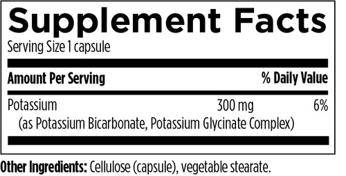 K+2 Potassium is a uniquely formulated potassium product composed of potassium bicarbonate and potassium bound to the amino acid glycine, which gives the product optimum potency, stability and tolerability. This alkalinizing formula provides nutritional support to help maintain healthy blood pressure levels.** Recommended Use: As a dietary supplement, take one capsule per day, or as directed by your health care practitioner.