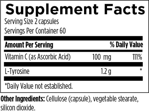 Tyrosine is a non-essential amino acid synthesized in the body from the amino acid phenylalanine. It is a precursor from which the body makes dopamine, which is then converted to norepinephrine and then to epinephrine. This formula provides 1200 mg of L-tyrosine, along with vitamin C for its role as a cofactor in neurotransmitter production. Tyrosine is ideally taken on an empty stomach or two hours before a protein-containing meal to avoid competition with other amino acids for absorption. Recommended Use: As a dietary supplement, take two capsules per day on an empty stomach, or as directed by your health care practitioner.