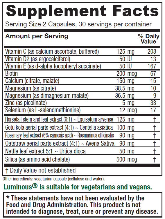The health of our hair, skin and nails are often a reflection of our general health. Dietary factors, stressors, sun damage, environmental exposures and physical health conditions can influence and even cause damage and abnormal conditions of our hair, skin and nails. Hair, skin and nails also age just as the rest of us does. Providing the nutrients that support skin collagen formation, tissue strength and tissue elasticity, and minerals that hair and nails need to grow and remain strong are the keys to maximizing their continued health. Utilizing the available scientific research as well as the experience of traditional herbals, this formula is important in maintaining a healthy and vital look. Usual dose is 2 to 6 capsules per day, or as recommended by your physician.