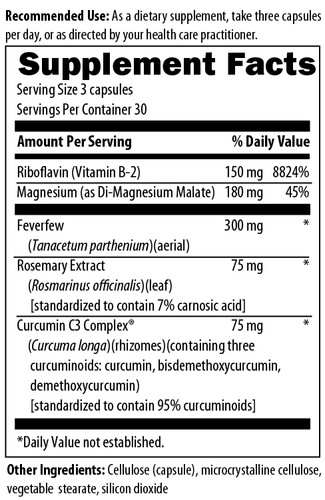 Migranol™ contains an extract of feverfew, a traditional herb that has been used since the first century and is known for its ability to support a healthy inflammatory response. Curcuminoids and rosemary are also included for their antioxidant properties as well as their role in supporting a balanced inflammatory response. Magnesium is added for its effects on muscle relaxation.** Recommended Use: As a dietary supplement, take three capsules per day, or as directed by your health care practitioner.