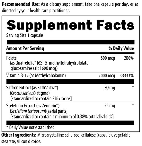 Mood-Stasis™ is a blend of vitamins and herbs that work synergistically to support a calm and positive mental outlook. It contains vitamin B12 and folate, along with saffron and sceletium extracts, which have been shown to support a normal response to stress.**