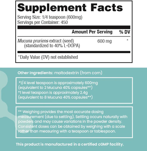 Pregnant or nursing women should consult with their healthcare professional before taking Mucuna 40% powder.