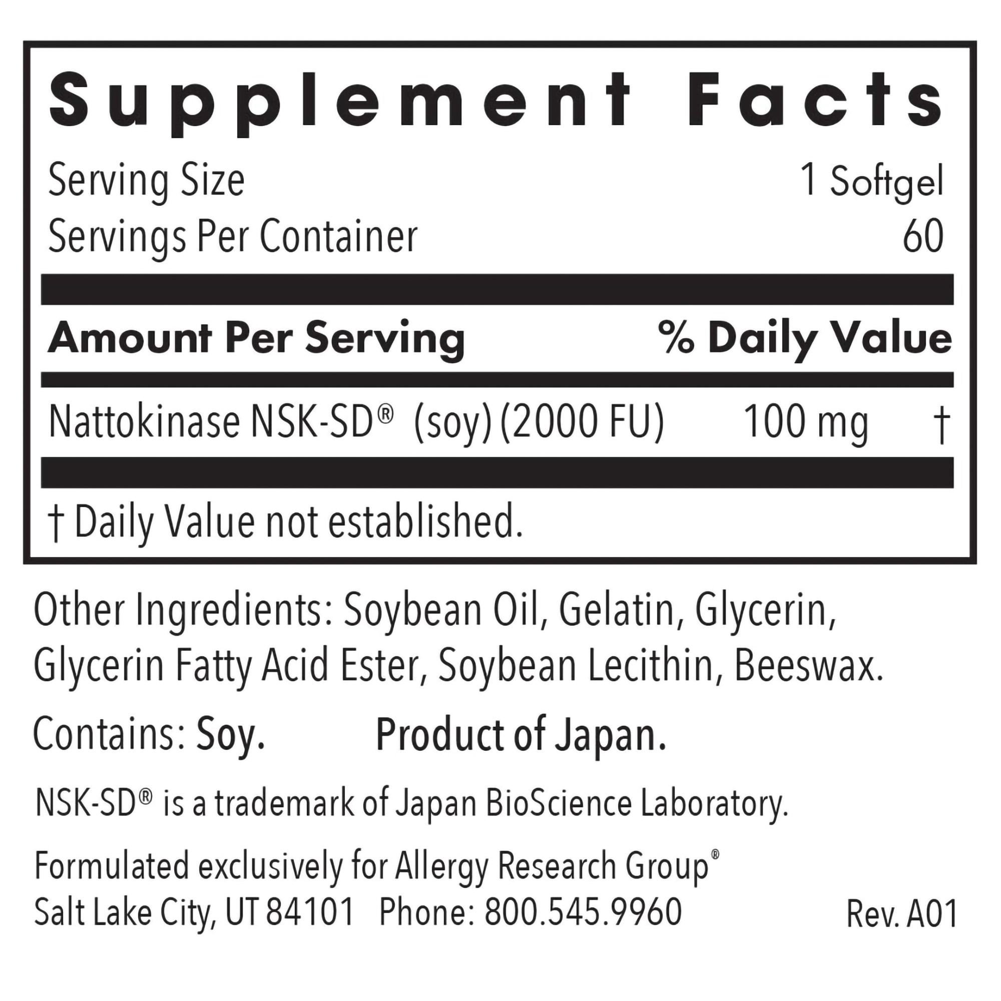 Isolated, purified and encapsulated nattokinase, an enzyme derived from boiled soybeans and a selected, patented strain of Bacillus subtilis natto. Nattokinase NSK-SD® was the first nattokinase introduced into the US market, and it has established standardization and quality levels for all nattokinase, with comprehensive safety studies and proven potency. It is vegetarian, non-irradiated, and free of vitamin K2. NSK-SD® has two Japanese and three U.S. patents, and is recognized by the JHFA (Japan Health and Nutrition Food Authorization) and JNKA (Japan Nattokinase Association) as authentic nattokinase. NSK-SD® is a trademark of Japan BioScience Laboratory.