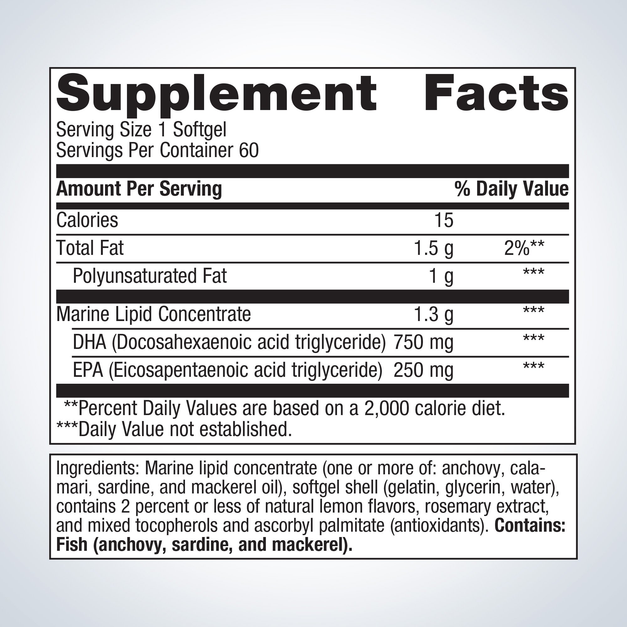 Other Ingredients: Marine lipid concentrate (one or more of: anchovy, calamari, sardine, and mackerel oil), softgel shell (gelatin, glycerin, water), contains 2 percent or less of natural lemon flavors, rosemary extract, and mixed tocopherols and ascorbyl palmitate (antioxidants).