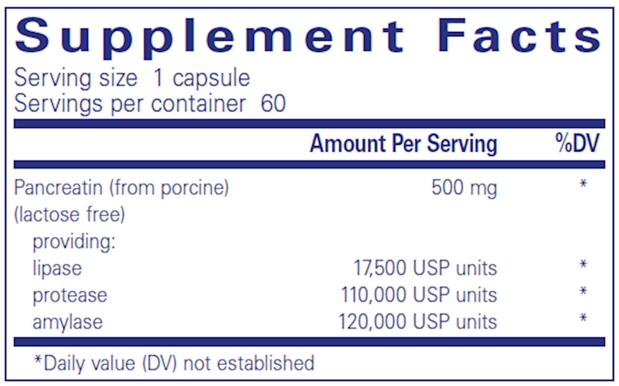 This formula is designed to aid the body’s natural digestive process. It provides a highly concentrated form of enzymes naturally secreted by the pancreas which are essential to the digestion of food and absorption of nutrients. The formula contains lipase, which digests fat; proteases, which digest protein; and amylases, which digest starch. This formula is offered in acid-resistant capsules to maximize deliveryto the G.I. tract.*
