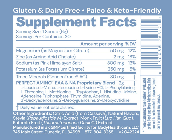 PERFECT AMINO® Electrolytes contain a precise ratio of electrolytes and minerals for optimal hydration and nervous system function, PERFECT AMINO® essential amino acids for full electrolyte utilization, and nucleic acid building blocks to assist in proper synthesis of PERFECT AMINO®.