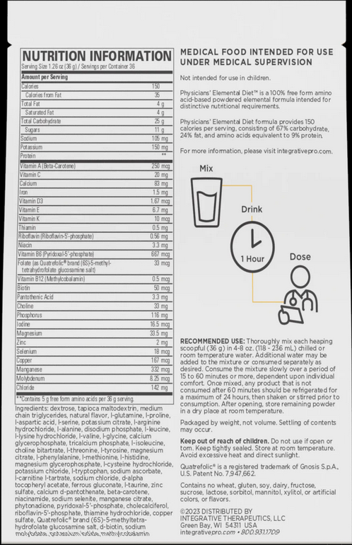 Physicians’ Elemental Diet is a medical food designed for the dietary management of moderate to severe impaired gastrointestinal (GI) function, including irritable bowel syndrome (IBS), inflammatory bowel disease (IBD), and small intestinal bacterial overgrowth (SIBO). 1296 grams. 36 servings.