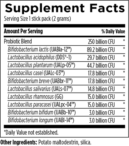 ProbioMed™ 250 is our most highly potent, shelf-stable, dairy-free probiotic formulation containing 250 billion CFU per serving. It consists of 10 of the most highly-researched probiotic strains, with each strain and specific CFU count being fully disclosed. These are robust strains that are capable of surviving the harsh journey to the intestines and are able to attach to the intestinal walls, where they can grow and function effectively to support gastrointestinal health.* ProbioMed™ 250 is offered in the novel, single-serving stick packs that are lined with moisture-resistant, oxygen-resistant, and light-resistant film to preserve viability. They do not require refrigeration, which makes them convenient for travelers and anyone on the go.