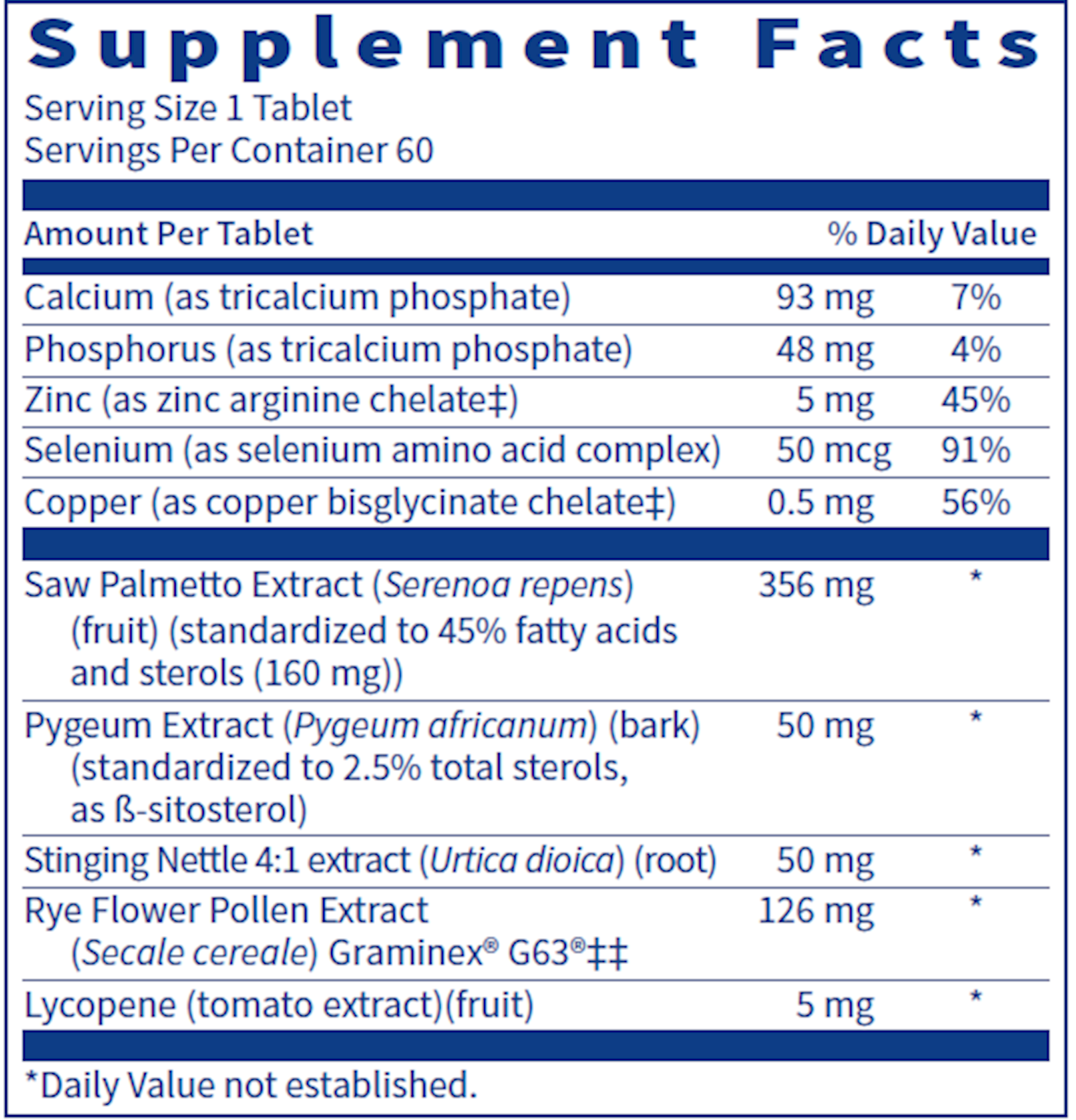 Saw palmetto is highly useful for support of prostate function in adult men, and so are a number of other plant extracts and nutrients.* Four botanical extracts with recognized roles in prostate health are combined in ProstaThera™ to augment the actions of MultiThera® multivitamin formulas along with key trace elements and lycopene creating a highly beneficial prostate-support program. These ingredients influence testosterone metabolism and promote a favorable balance with dihydrotestosterone, help reduce an age-related decline in prostaglandin production, and help maintain normal cell and tissue functions.* Graminex® flower pollen extract contributes a unique, natural spectrum of amino acids, carotenoids, flavonoids, phytosterols, nucleic acids, minerals, vitamins, and enzymes and has been shown in numerous clinical trials to be particularly beneficial for prostate and urinary function.*