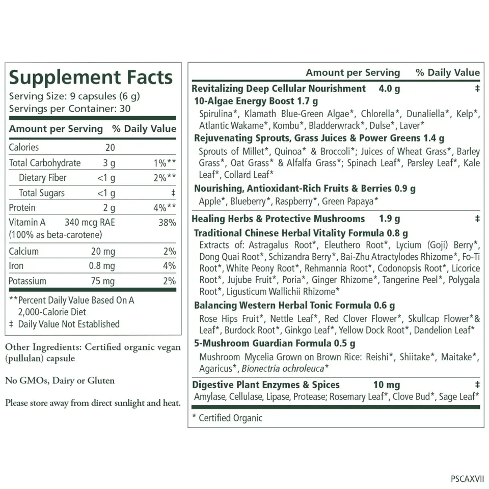 Unites deeply restorative herbs and mushrooms with regenerating supergreens and fruits to nourish and balance your body and mind. 270 capsules.
