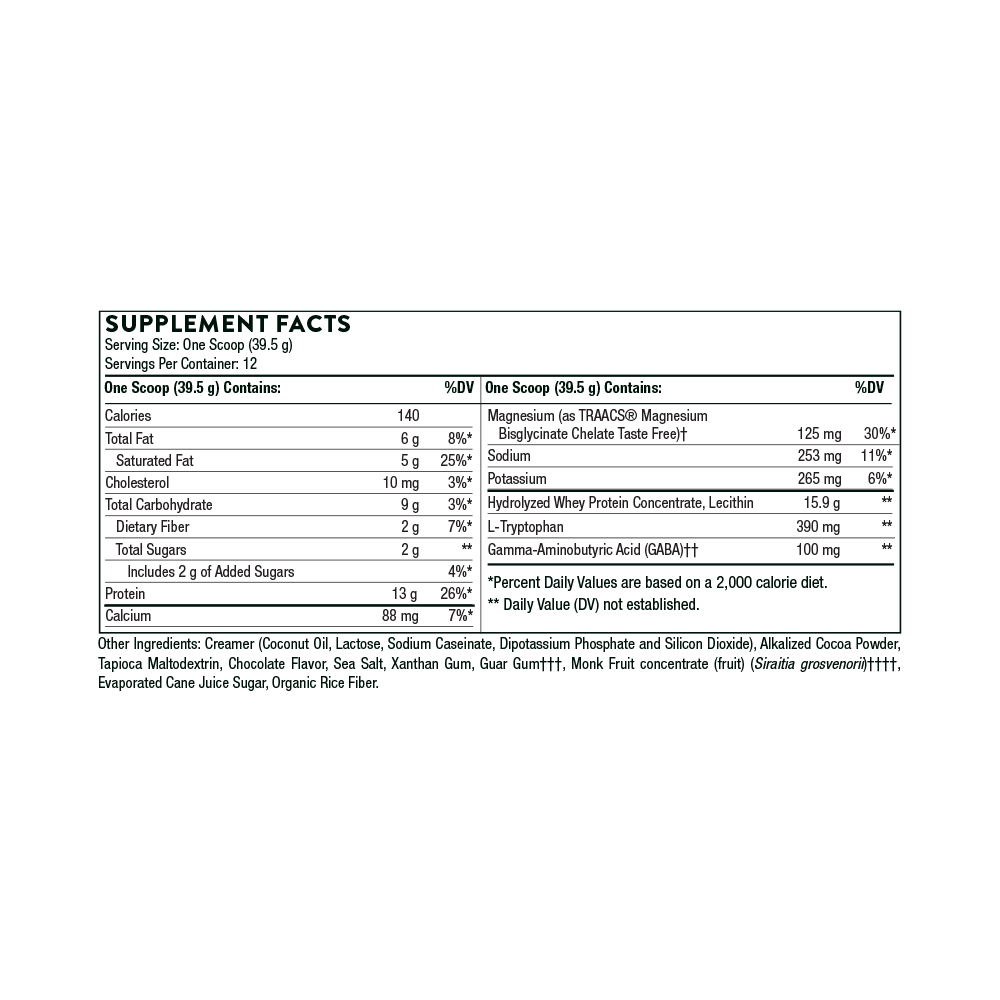 Elite athletes, high school athletes, and weekend warriors all have one thing in common – the need to fully recover, so they can be ready for tomorrow’s training. Thorne’s RecoveryPro helps moderate stress and encourages restful sleep while optimizing nighttime muscle recovery.* Mix one scoop of the chocolate-flavored powder with 8 ounces of hot or cold water before bedtime. Benefits of RecoveryPro: • Contains 13 grams of whey protein to promote muscle repair* • Nighttime consumption has been clinically studied for moderating stress, improving morning alertness, and supporting memory* • Tryptophan and magnesium bisglycinate promote restful sleep* • High in cysteine, an amino acid linked to improvements in athletic performance* • Great source of branched-chain amino acids that promote muscle repair* • PharmaGABA is a natural source of GABA, a calming brain neurotransmitter that acts like a brake during times of stress* • Magnesium bisglycinate has been shown to relax both smooth muscle and skeletal muscle*