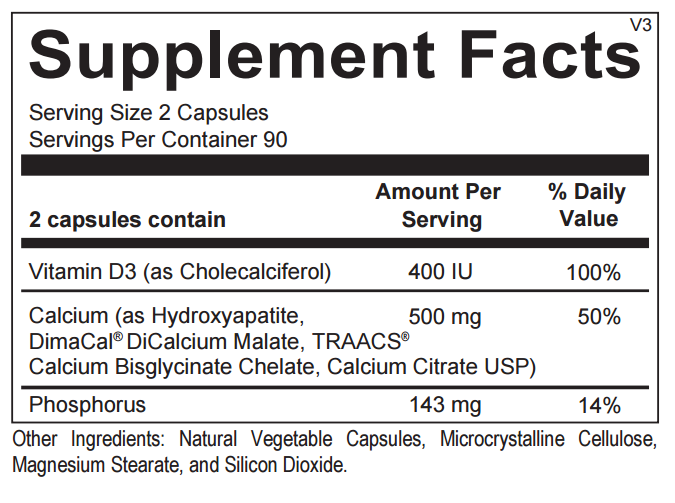 Calcium is required for strong bones, heart health, muscle function, nerve transmission, intracellular signaling and hormonal secretion. It is less than 1% of total body calcium that supports these critical metabolic functions. The body uses bone tissue as a reservoir for calcium, as well as a source of calcium, to maintain constant concentrations of calcium in blood, muscle and intercellular fluids. The remaining 99% of the calcium supply in the body is stored in the bones and teeth, serving as a mineral reserve and structural support for the body. Reacted Calcium provides three unique forms of highly-absorbed calcium to ensure maximum absorption of this important macromineral. While most calcium supplements use only a single source of calcium, which can easily overwhelm a single pathway of absorption and limit uptake, Reacted Calcium takes advantage of three unique pathways of absorption by providing calcium in the hydroxyapatite, di-calcium malate, and glycinate forms. In addition, Reacted Calcium includes vitamin D and phosphorus, both critical nutrients for bone mineralization and remodeling. Suggested Use: 1-2 capsules three times per day or as recommended by your health care professional