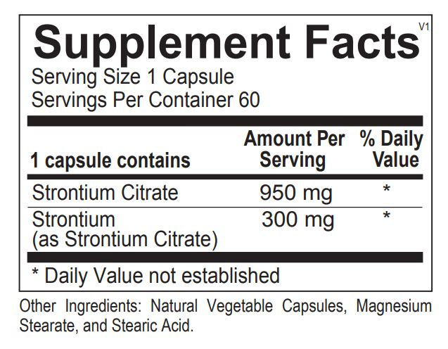 Strontium is a mineral that has similar properties to calcium. Researchers reporting in the New England Journal of Medicine found a 41% reduction in vertebral fractures over three years when adding strontium to a stable calcium and vitamin D diet regimen. 60 capsules.