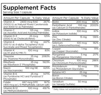 Feeling like you’re not functioning at your peak— that your body and mind aren’t performing the way you would like? Maybe it’s time you looked at your multivitamin! The Big One® (Daily Multivitamin) is a useful alternative for those who want a potent, pharmaceutical grade multivitamin, but require a milder formula. The Big One contains all major vitamins and minerals found in a high quality multivitamin in a preservative and excipient free vegetarian capsule. Contains no iron. Usual dose is 1-3 capsules per day, or as directed by your physician.