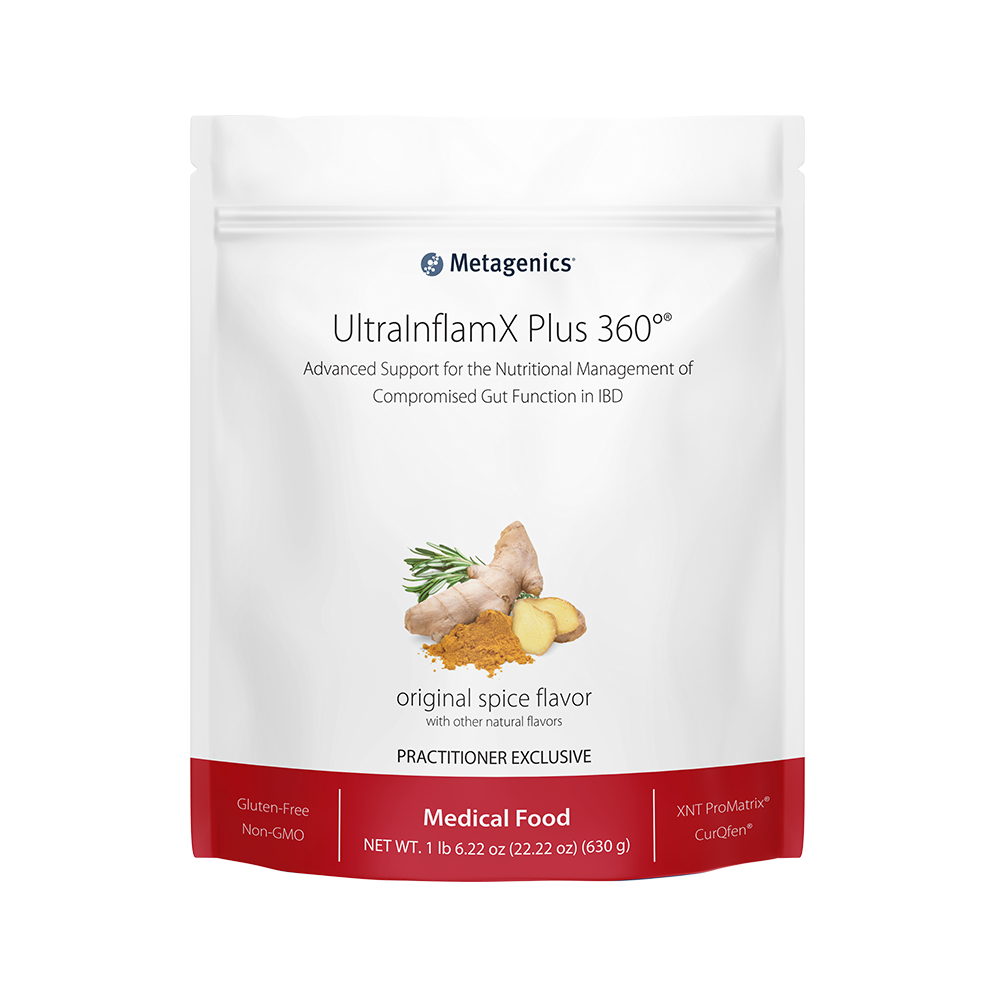 Other Ingredients: Pea protein isolate, isomalto-oligosaccharide, rice protein concentrate, rice bran, organic cane sugar, calcium citrate, high oleic sunflower oil, maltodextrin, flaxseed, magnesium citrate, medium-chain triglycerides, L-lysine HCl, silica, natural flavors,^ L-leucine, L-glutamine, L-valine, dipotassium phosphate, L-isoleucine, rice protein matrix and polyphenols from hops extract, proprietary mix of curcumin and fenugreek galactomannans, quercetin, vitamin and mineral blend (zinc gluconate, ascorbic acid, manganese gluconate, d-alpha tocopheryl acetate, copper gluconate, D-biotin, retinyl palmitate, niacinamide, cholecalciferol, d-calcium pantothenate, chromium picolinate, pyridoxine HCl, riboflavin, potassium iodide, thiamin HCl, methylcobalamin, calcium L-5-methyltetrahydrofolate, and selenomethionine), malic acid, xanthan gum, ginger rhizome extract, rosemary leaf extract, Luo Han Guo fruit (monk fruit) extract, and guar gum. Directions: Blend (for no longer than 15 seconds), shake, or briskly stir 2 level scoops of UltraInflamX Plus 360° (47 g) into 8 fluid ounces of chilled water, juice, or acceptable fruit as listed in the dietary guidelines. Take twice per day or as recommended by your healthcare practitioner. Consume within 10 minutes of reconstitution. Refer to the UltraInflamX medical food program guide for easy-to-follow guidelines, tips, recipes, and more. This product is non-GMO and gluten-free. WARNING: If pregnant, nursing or taking prescription drugs such as anticoagulant or antiplatelet medication, consult your healthcare practitioner prior to use. Keep out of the reach of children. Tamper Evident: Do not use if package is torn or open. Storage: Keep closed in a cool, dry place.