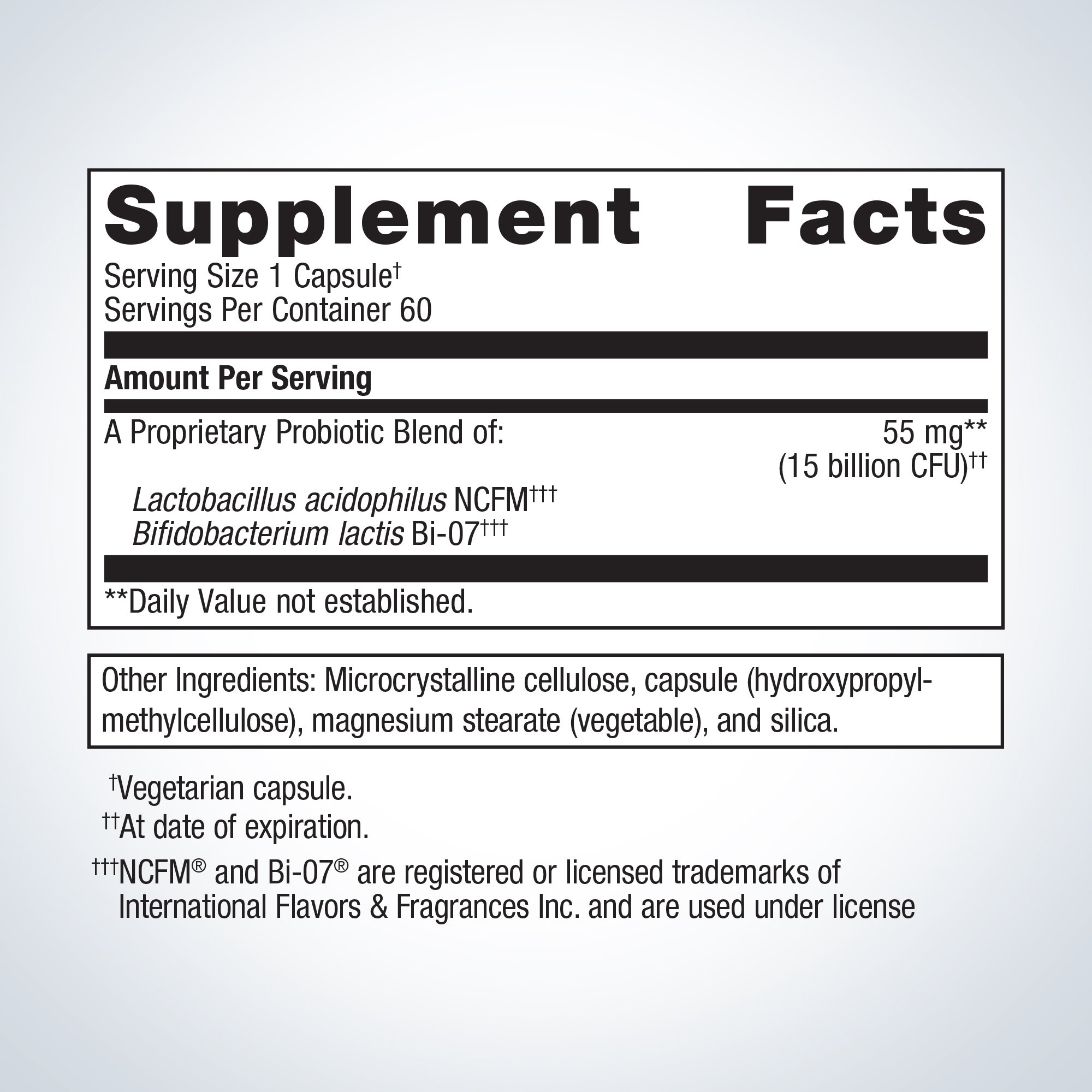 Ingredients: Microcrystalline cellulose, capsule (hydroxypropylmethylcellulose), Lactobacillus acidophilus NCFM, magnesium stearate (vegetable), Bifidobacterium lactis Bi-07, and silica. Directions: Take one capsule one to two times daily or as directed by your healthcare practitioner. This product is non-GMO, gluten-free, and vegetarian.