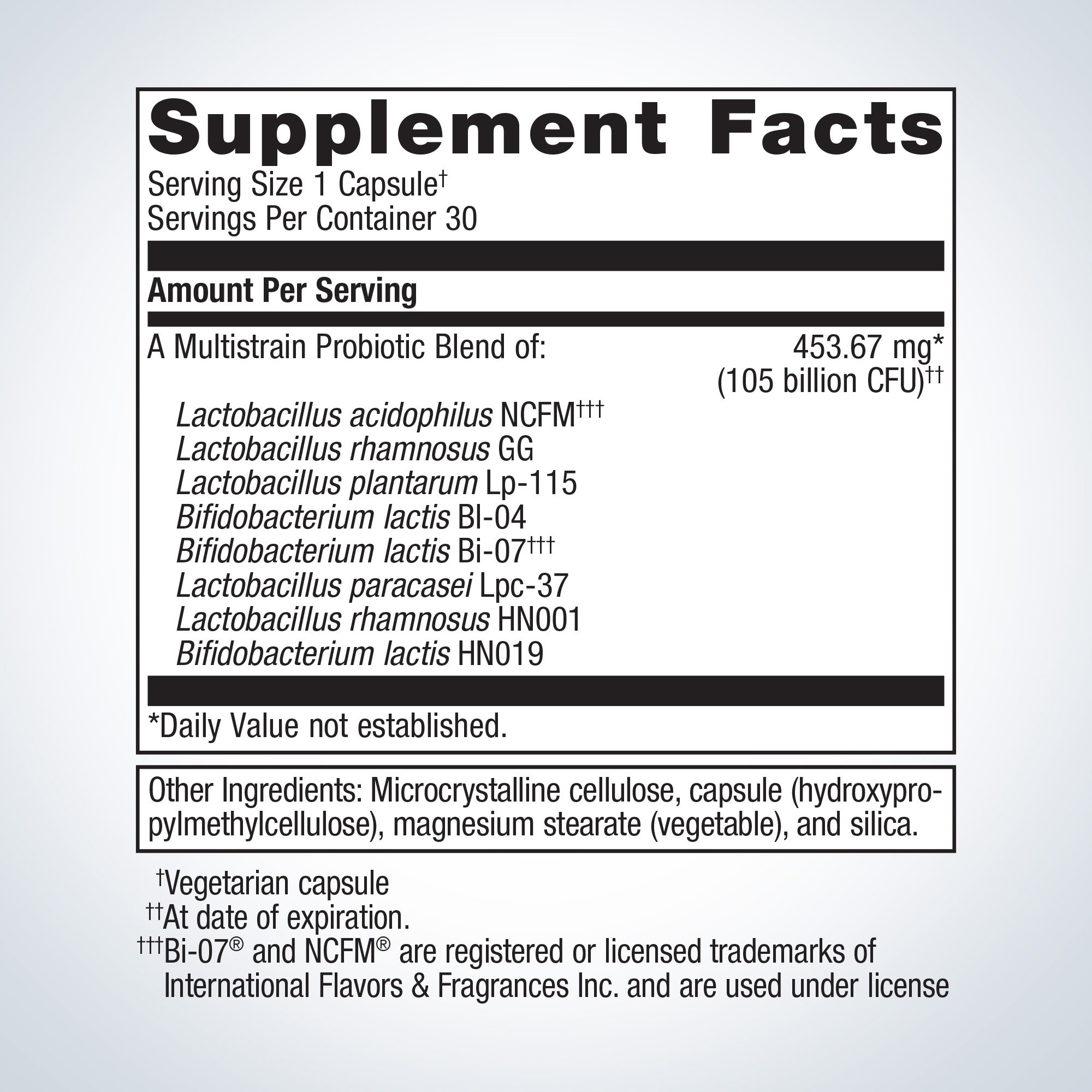 A Multistrain Proprietary Blend of: 453.67 mg* (105 billion CFU)††