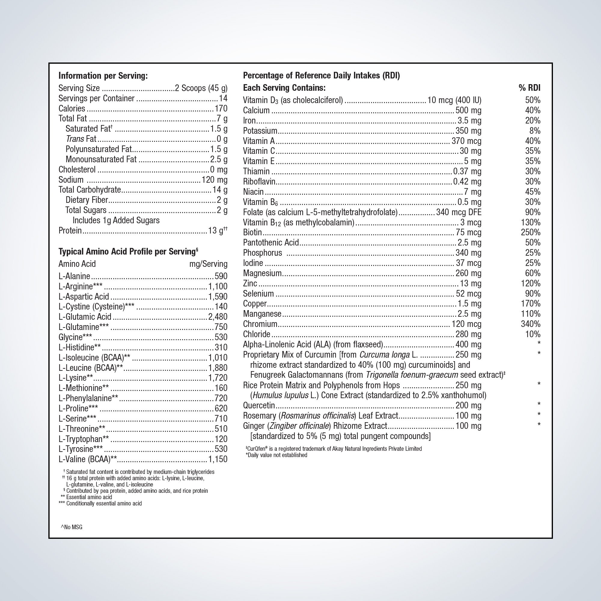 Other Ingredients: Pea protein isolate, isomalto-oligosaccharide, rice protein concentrate, rice bran, calcium citrate, olive oil, maltodextrin, flaxseed powder, magnesium citrate, silica, medium-chain triglycerides, L-lysine HCl, L-leucine, L-glutamine, L-valine, dipotassium phosphate, L-isoleucine, natural flavors,^ rice protein matrix and polyphenols from hops extract, proprietary mix of curcumin and fenugreek galactomannans, quercetin, vitamin and mineral blend (zinc gluconate, ascorbic acid, manganese gluconate, d-alpha tocopheryl acetate, copper gluconate, D-biotin, retinyl palmitate, niacinamide, cholecalciferol, calcium D-pantothenate, chromium picolinate, pyridoxine HCl, riboflavin, potassium iodide, thiamin HCl, methylcobalamin, calcium -methyltetrahydrofolate, and selenomethionine), malic acid, xanthan gum, ginger rhizome extract, 5 Lrosemary leaf extract, Luo Han Guo fruit (monk fruit) extract, and guar gum.