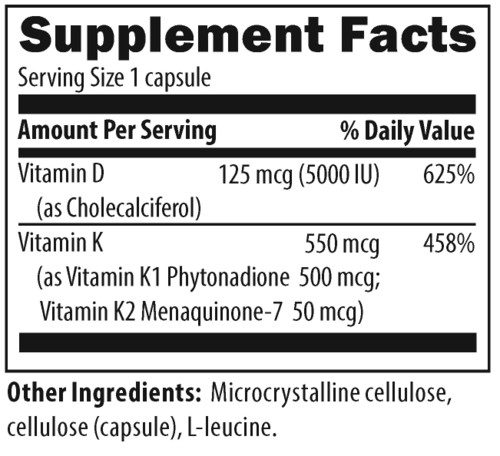 Vitamin D Supreme provides a clinically useful dose of vitamin D3 along with vitamin K as both K1 and the MK-7 form of K2. This formula contains higher targeted doses than Vitamin D Synergy for situations where more aggressive repletion is required. Vitamins D and K are essential for optimal bone and arterial health and for maintaining the immune system in proper balance.** The amount of vitamin D and K in this formula may be beneficial for those who do not get adequate sun exposure and/or dietary sources of these vitamins. Vitamins D and K work as a team. Thus, increasing doses of vitamin D will increase the need for vitamin K.