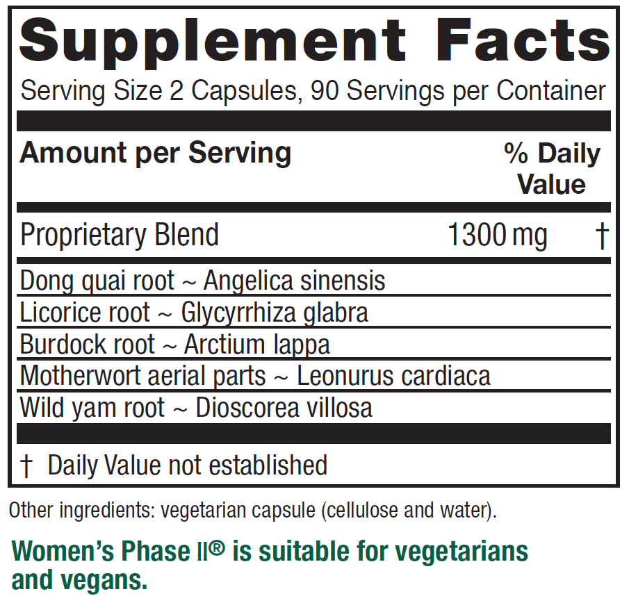 Women’s Phase II provides a broadly acting combination of herbs for the perimenopausal or menopausal woman for body support and symptom relief.