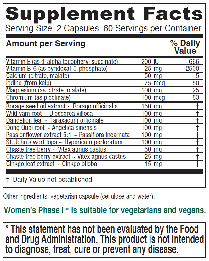 Utilizing the latest in German botanical research, related nutritional research and over a decade of clinical experience, Women’s Phase I has been formulated to promote balanced premenstrual support.
