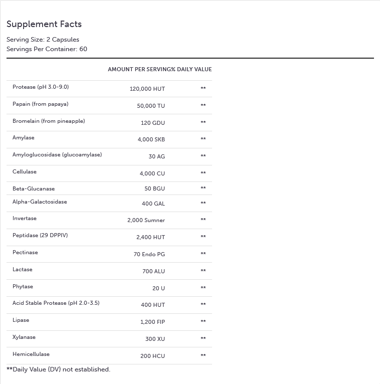 Digestive enzyme formula suitable for vegans and designed to support the digestion of fat, protein, carbohydrate, fiber, and lactose. 120 capsules.