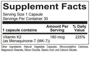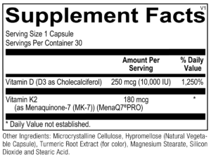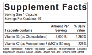 This product provides therapeutic doses of the bone building nutrients vitamin K2 as MK7 in a new, higher 180mcg dose, and vitamin D3 in a 5000 IU dose. This formula is an excellent adjunct to a good multivitamin, or for those who have low vitamin D3 or K2 levels. 60 capsules.