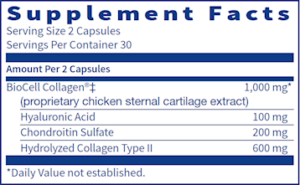 BioCell Collagen® is hydrolyzed type II collagen that provides a complex matrix of elements (collagen type II, chondroitin sulfate, and hyaluronic acid) that support joint and skin health. 60 capsules.